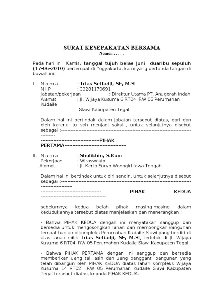 Komitmen Contoh Surat Kesepakatan Bersama - 1 / Dan pihak kedua menyatakan setuju/sepakat dengan ketentuan sebagai berikut :.